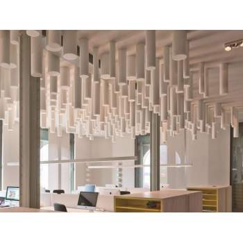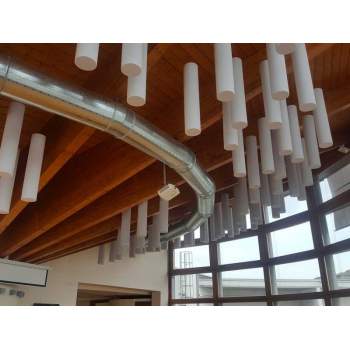 The RÖR acoustic cylinder is a fireproof sound absorber with a wide range of absorption (wide band), especially appreciated by architects and decorators, it is a highly versatile acoustic panel with an extraordinary acoustic performance. They can be installed in vertical or horizontal, glued or suspended, it is possible to combine different lengths and diameters creating an unique space with great aesthetic harmony.