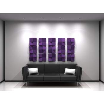 Absorbente acústico de diseño polivalente, formato piezas de 15 x 15cm (60mm espesor). Pack de 32 o 60 unidades. Ideal para techo - pared posterior. Espuma ZHFR, color antracita, granate o violeta, auto extinguible, E-d0 (UNE-EN 13501-1).