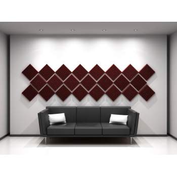 Panel absorbente acústico de diseño único, placas de 60 x 60cm (64mm espesor). Cajas de 8 - 12 unidades para cubrir hasta 2,9 - 4,3m2. Espuma ZHFR, color antracita o granate, auto extinguible, E-d0 (UNE-EN 13501-1).