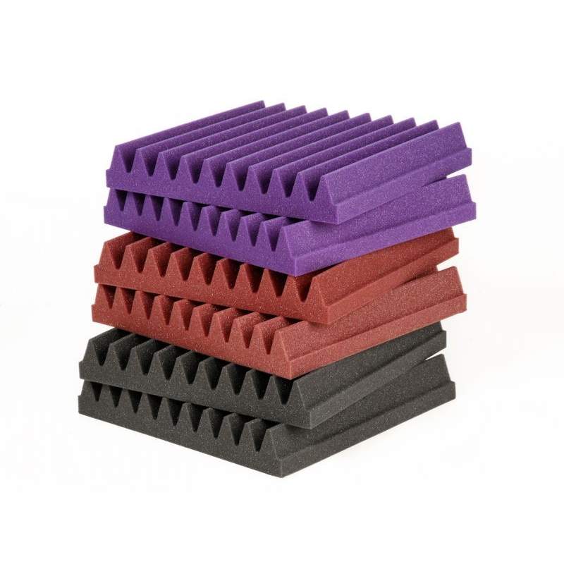 Panel absorbente acústico de pequeño formato, placas de 30 x 30cm (50mm espesor). Cajas de 24 - 32 unidades para cubrir hasta 2,2 - 2,9m2. Espuma ZHFR, color antracita, granate o violeta, auto extinguible, E-d0 (UNE-EN 13501-1).