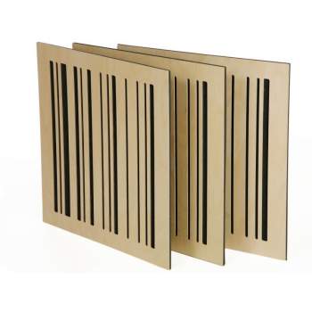 Trampa de graves de madera de 595 x 595mm (139mm espesor). Cajas de 2 unidades (0,71m2), fabricadas con núcleo de espuma y panel de madera. Óptimo rendimiento acústico para salas de control y mastering.